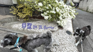 ミニチュアシュナウザーのワンコ達、ツツジの季節でも興味なし