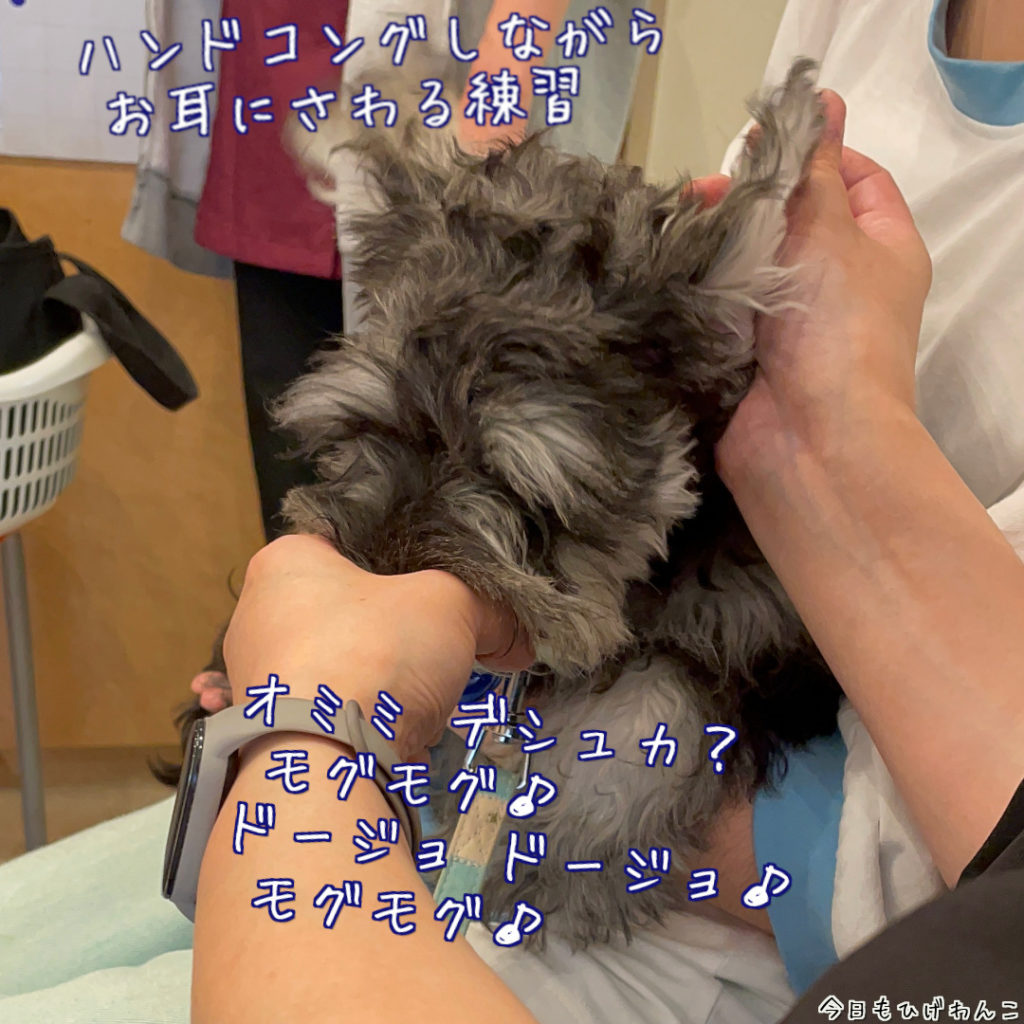 ハンドコングでゴハンを食べている間に、体のあちこちを触られても嫌がらないようにするトレーニングです。写真は耳を触っているところ。今日は耳以外に足に触る練習もしました。