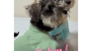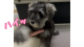 ミニチュアシュナウザーのエーちゃん、お手特訓中