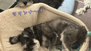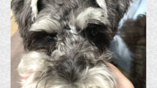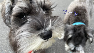 ミニチュアシュナウザーのワンコズ、レイでお出迎え