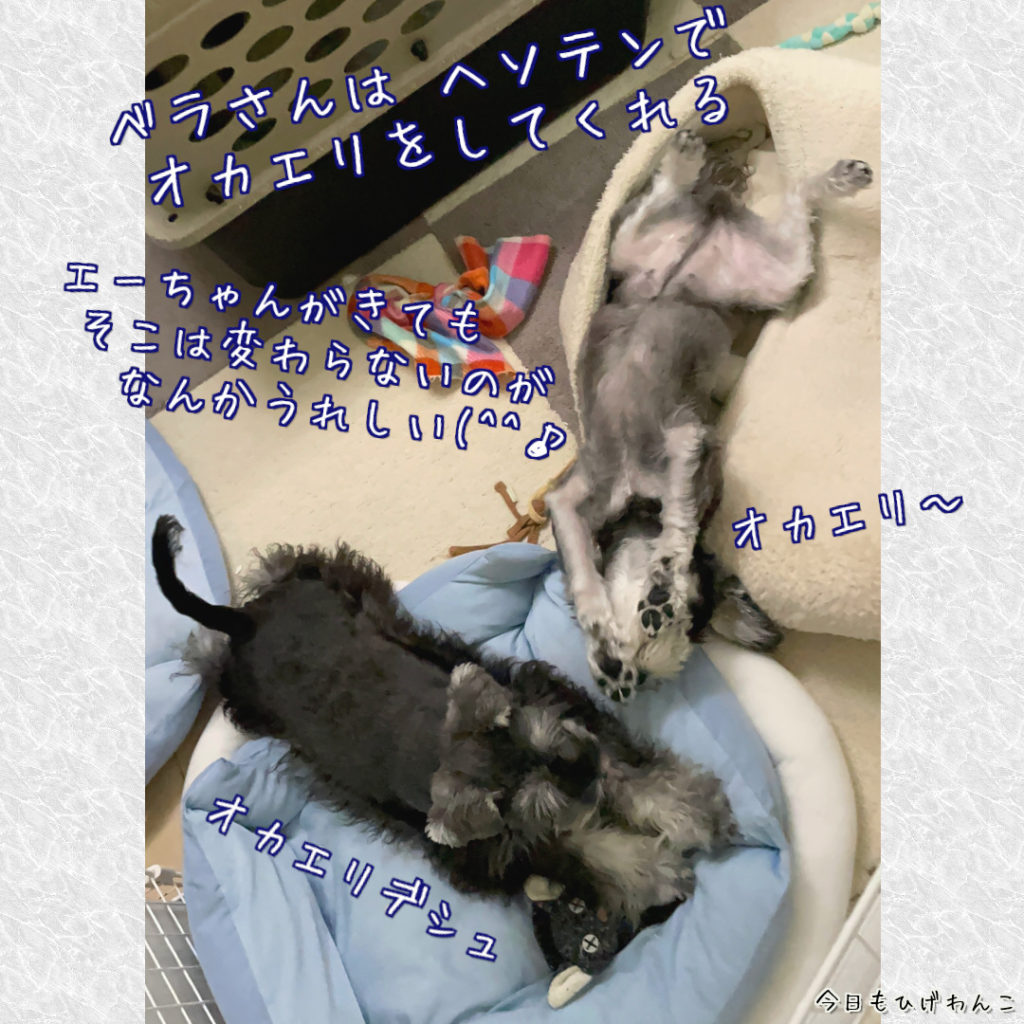 ベラさん、昔からオカエリのときにはお腹を出してお迎えしてくれます。それはエーちゃんがやってきてからも変わりません。
