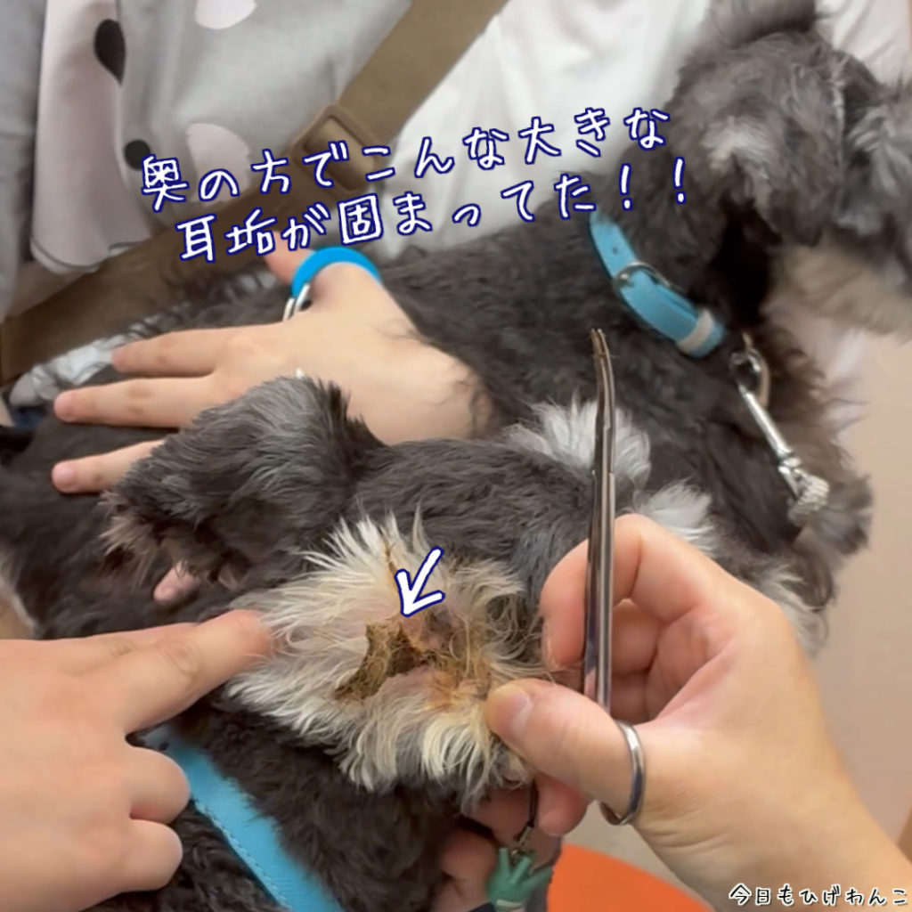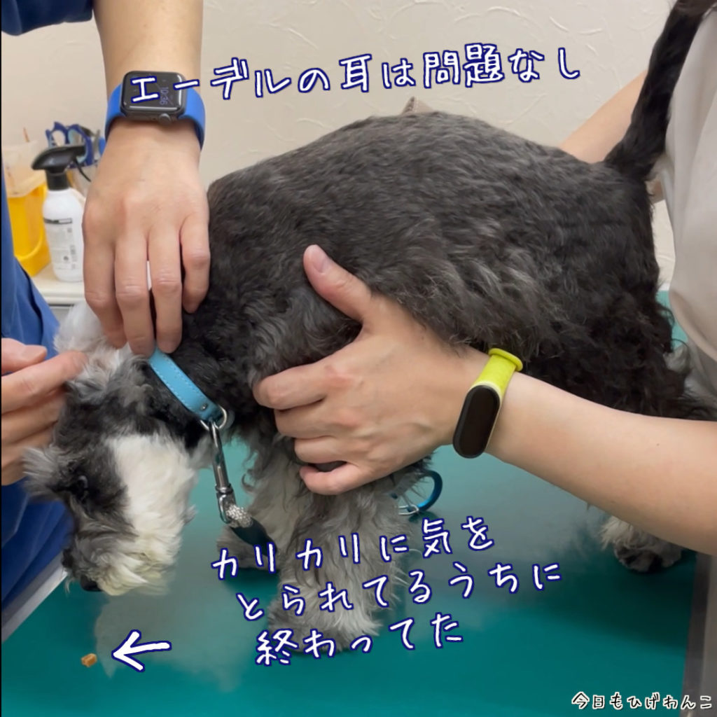 以前と同じように、大きな耳垢が奥の方で固まってました。耳の分泌物などの影響で個体差あるらしいです。ベラさんも片耳だけですが、自宅では耳の奥の方まで掃除は難しいので、定期的に病院で診てもらう方がよいみたいです。