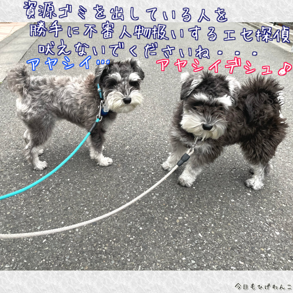 ワンコ達、資源ゴミのカンとかペットボトルを出している人を勝手に不審人物認定・・・。