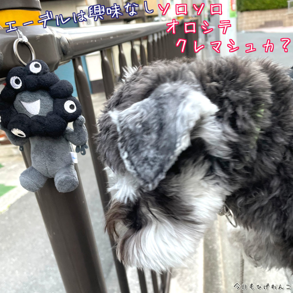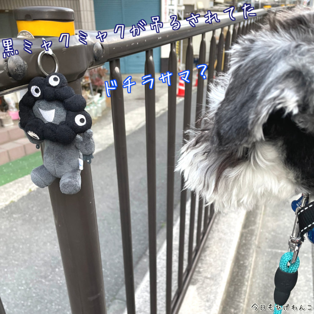 ワンコ達、あさんぽコースに黒ミャクミャクが吊るされているのを発見!