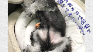 ミニチュアシュナウザーのエーちゃん、落ち着く寝相はへそてんです